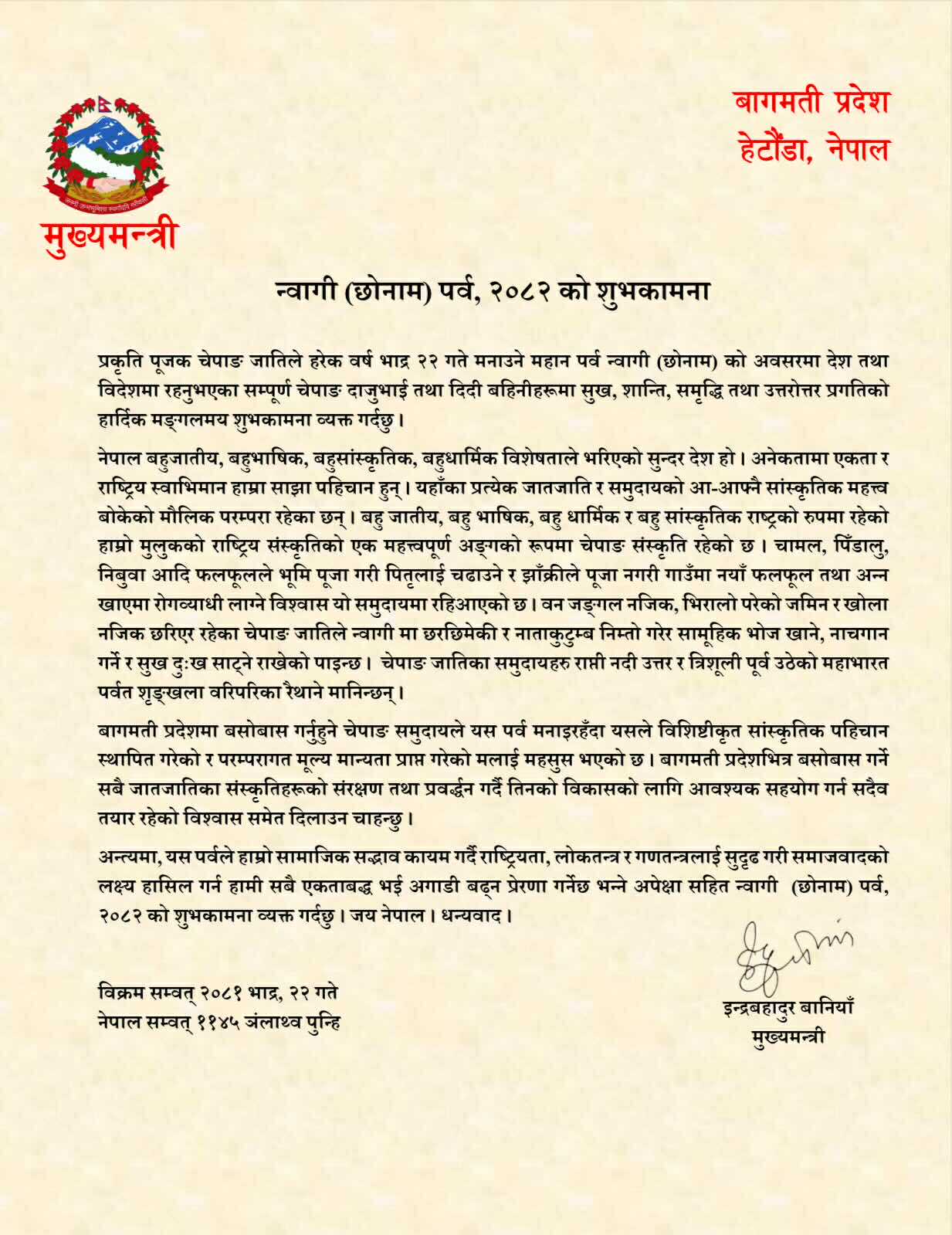 हेटौंडा । बागमती प्रदेशका मुख्यमन्त्री इन्द्रबहादुर बानियाँले चेपाङ समुदायको महान पर्व न्वागी (छोनाम)–२०८२ को अवसरमा देश–विदेशमा रहेका सम्पूर्ण चेपाङ दाजुभाइ तथा दिदीबहिनीहरूमा सुख, शान्ति, समृद्धि र प्रगतिका लागि शुभकामना व्यक्त गरेका छन्।