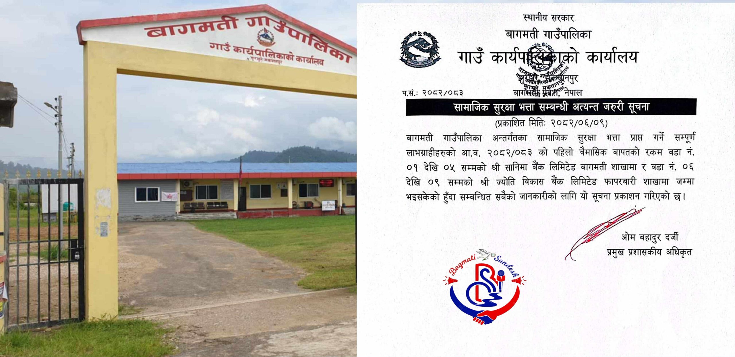 बिहीवार एक सूचना जारी गर्नुहुँदै बागमती गाउँपालिकाका प्रमुख प्रशासनिक अधिकृत ओम बहादुर दर्जीले सामाजिक सुरक्षा भत्ता वितरणबारे जानकारी गराउनुभयो।